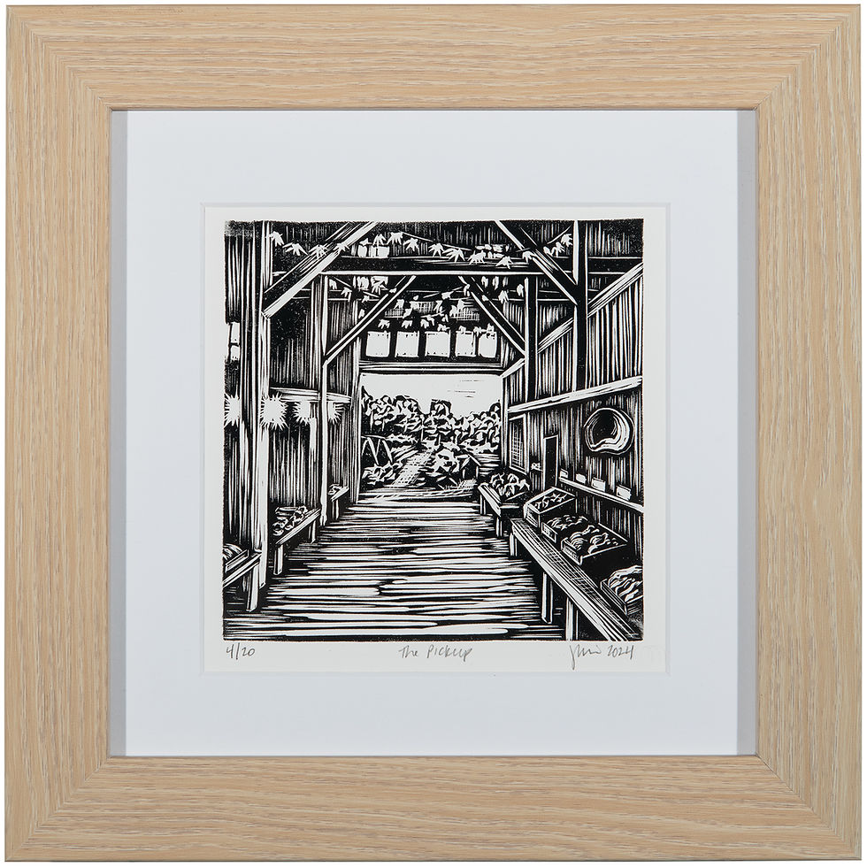 Framed pieces on display can be taken within two weeks of purchase. Contact me to arrange pickup at Belleflower.